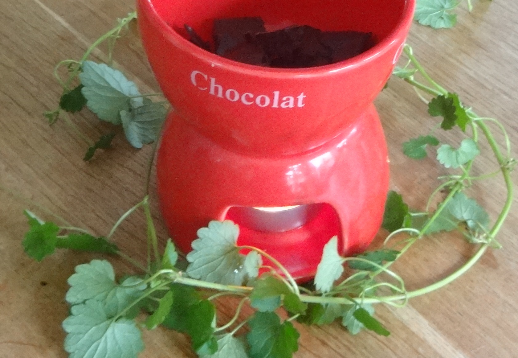 Gundermannranken ernten, nierenförmige Blättchen einzeln abzupfen und in geschmolzene Schokolade tauchen;
