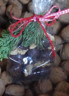 Alternativ Walnusshälften in Gewürzschokolade tauchen und auf dem Backpapier trocknen lassen. In Celophanbeutel hübsch verpacken.